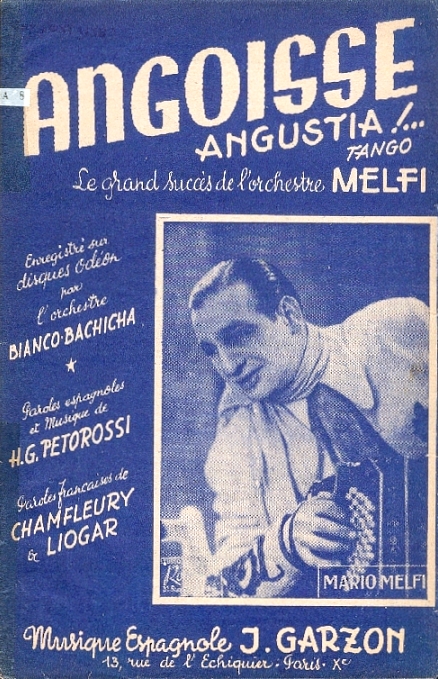 Angustia (A) [ Llora corazón ] [ Angoisse ] Genre : Tango - Date : ± 1925 - Musique : Pettorossi, Horacio - Paroles espagnoles : Pettorossi, Horacio - Paroles françaises : Chamfleury, Robert / Liogar - Edition : J.Garzon. 1973. Paris - |
