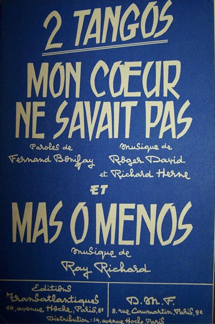 Mon coeur ne savait pas Genre : Tango - Date : xxx - Musique : David, Roger ▲▲ / Herne, Richard - Paroles : Bonifay, Fernand - Editions : Editions Transatlantiques. Paris / D.M.F. Paris - |
